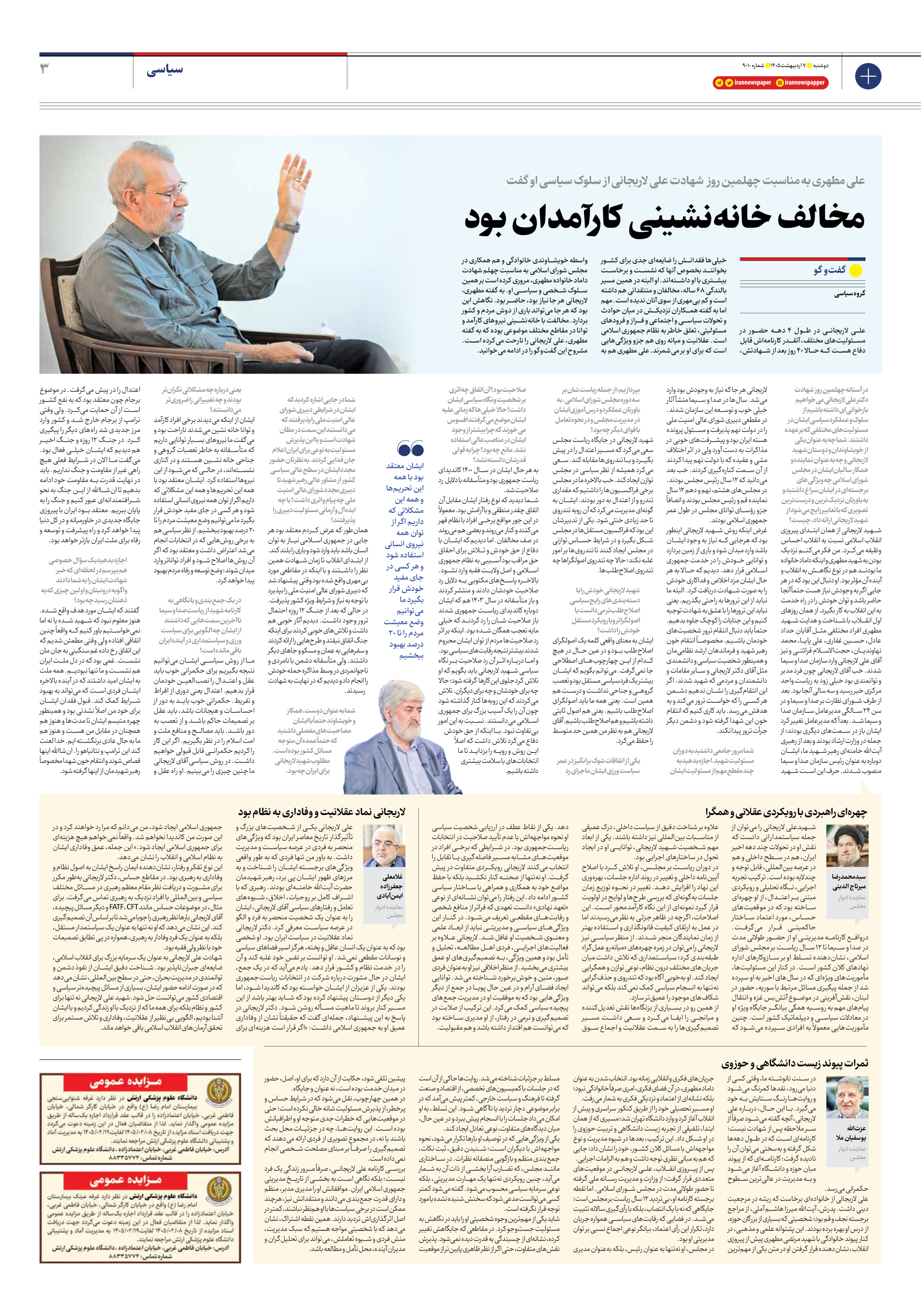 علی لاریجانی در طول ۴ دهه حضور در مسئولیتهای مختلف، آنقدر کارنامهاش قابل دفاع هست که حالا ۴۰ روز بعد از شهادتش، خیلیها فقدانش را ضایعهای جدی برای کشور بخوانند بخصوص آنها که نشست و برخاست بیشتری با او داشتهاند. او البته در همین مسیر بالندگی ۶۸ ساله، مخالفان و منتقدانی هم داشته است و کم بیمهری از سوی آنان ندیده است. مهم اما به گفته همکاران نزدیکش در میان حوادث و تحولات سیاسی و اجتماعی و فراز و فرودهای مسئولیتی، تعلق خاطر به نظام جمهوری اسلامی است. عقلانیت و میانه روی هم جزو ویژگیهایی است که برای او بر میشمرند. علی مطهری هم به واسطه خویشاوندی خانوادگی و هم همکاری در مجلس شورای اسلامی به مناسبت چهلم شهادت داماد خانواده مطهری، مروری کرده است بر همین سلوک شخصی و سیاسی او. به گفته مطهری، لاریجانی هر جا نیاز بود، حاضر بود. نگاهش این بود که هر جا میتواند باری از دوش مردم و کشور بردارد. مخالفت با خانهنشینی نیروهای کارآمد و توانا در مقاطع مختلف موضوعی بوده که به گفته مطهری، علی لاریجانی را نارحت میکرده است. مشروح این گفتوگو را در ادامه میخوانید.