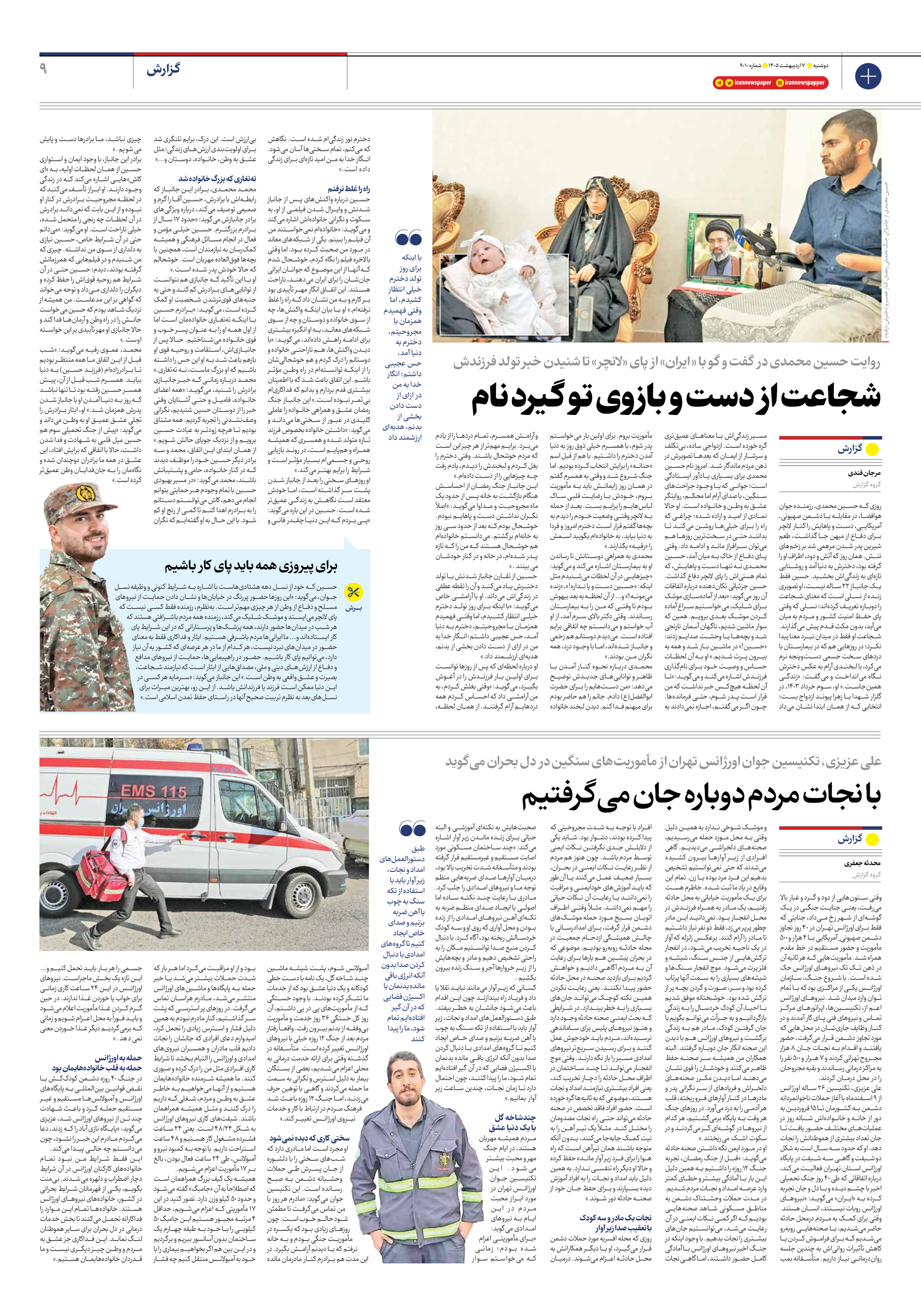روزی که حسین محمدی، رزمنده جوان هوافضا، در مقابله با دشمن صهیونی ـ آمریکایی، دست و پاهایش را کنار لانچر برای دفاع از میهن جا گذاشت، طعم شیرین پدر شدن مرهمی شد بر زخمهای تنش. همان روز که آتش و دود، اطراف او را گرفته بود، دخترش به دنیا آمد و روشنایی تازهای به زندگیاش بخشید. حسین فقط یک جانباز ۲۲ ساله نیست، او تصویری زنده از نسلی است که معنای شجاعت را دوباره تعریف کردهاند؛ نسلی که وقتی پای حفظ امنیت کشور و مردم به میان میآید، بدون مکث قدم پیش میگذارند. شجاعت او فقط در میدان نبرد معنا پیدا نکرد؛ در روزهایی هم که در بیمارستان با دردهای سخت جسمی دستوپنجه نرم میکرد، با لبخندی آرام به عکس دخترش نگاه میانداخت و میگفت: «زندگی همینجاست.» او، سوم خرداد ۱۴۰۳، در گلزار شهدا با زهرا پیوند ازدواج بست؛ انتخابی که از همان ابتدا نشان میداد مسیر زندگیاش با معناهای عمیقتری گره خورده است. ازدواجی ساده، بیتکلف و سرشار از ایمان که بعدها تصویرش در ذهن مردم ماندگار شد. امروز نام حسین محمدی برای بسیاری یادآور ایستادگی است؛ جوانی که با وجود جراحتهای سنگین، با صدای آرام اما محکم، روایتگر عشق به وطن و خانواده است. او حالا نمادی از امید و اراده شده؛ چراغی که راه را برای خیلیها روشن میکند تا بدانند حتی در سختترین روزها هم میتوان سرافراز ماند و ادامه داد. وقتی پای دفاع از خاک به میان آمد، حسین محمدی نه تنها دست و پاهایش، که تمام هستیاش را پای لانچر دفاع گذاشت. حسین جزئیاتی تکاندهنده درباره اتفاقات آن روز میگوید: «بعد از آمادهسازی موشک برای شلیک، میخواستیم سراغ آماده کردن موشک بعدی برویم. همین که سوار ماشین شدیم، ناگهان آسمان نارنجی شد و بچهها با وحشت صدایم زدند: «حسین!» در ماشین باز شد و همه به بیرون پرت شدیم.» او به آن لحظات حساس و وصیت خود برای نامگذاری فرزندش اشاره میکند و میگوید: «تا آن لحظه هیچکس خبر نداشت که من قرار است پدر شوم، حتی فرماندهها. چون اگر میگفتم، اجازه نمیدادند به مأموریت بروم. برای اولین بار میخواستم پدر شوم، با همسرم خیلی ذوق روز به دنیا آمدن دخترم را داشتیم. با هم از قبل اسم «حنانه» را برایش انتخاب کرده بودیم. اما جنگ شروع شد و وقتی به همسرم گفتم در همان روز زایمانش باید به مأموریت بروم، خودش با رضایت قلبی ساک لباسهایم را برایم بست. بعد از حمله به لانچر وقتی وضعیت خودم را دیدم به بچهها گفتم قرار است دخترم امروز و فردا به دنیا بیاید، به خانوادهام بگویید اسمش را «رقیه» بگذارند.»